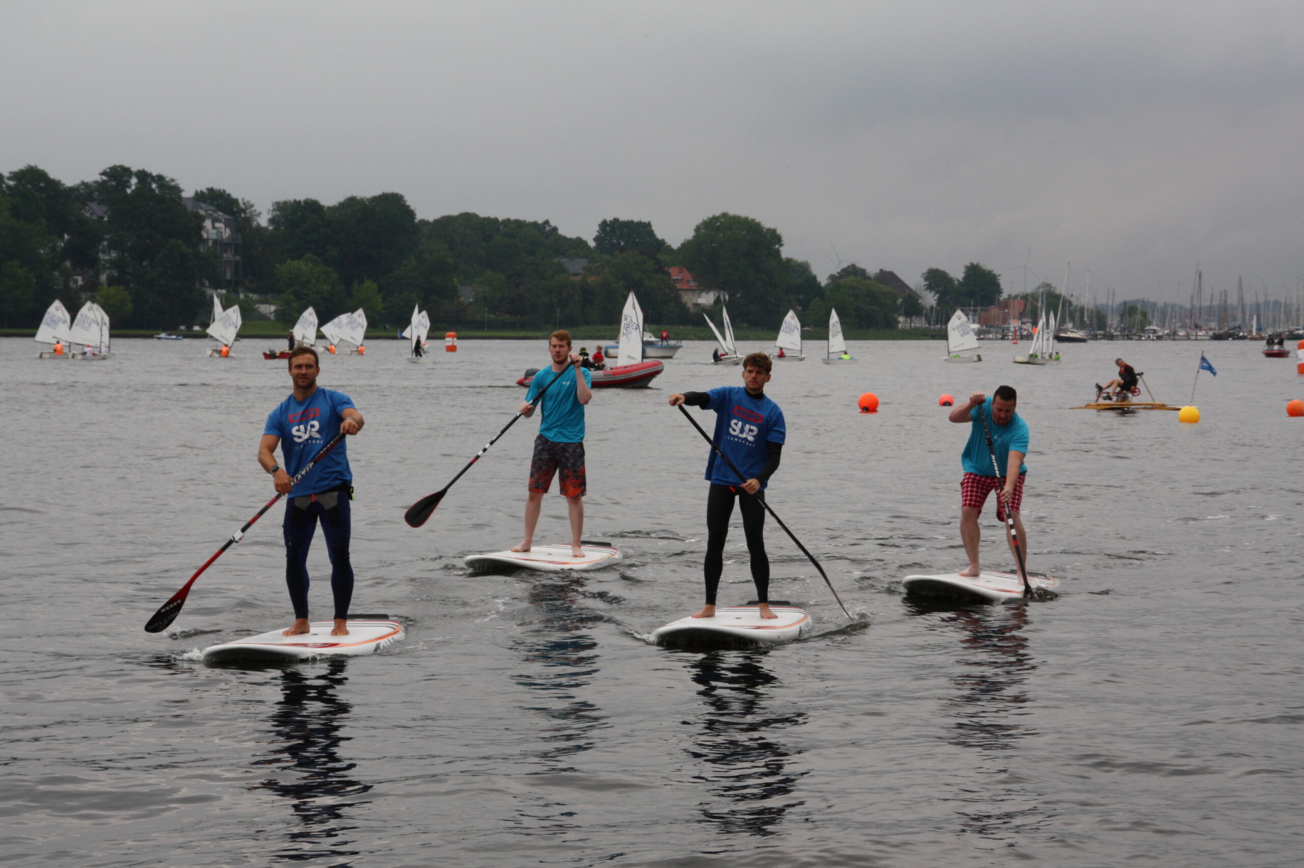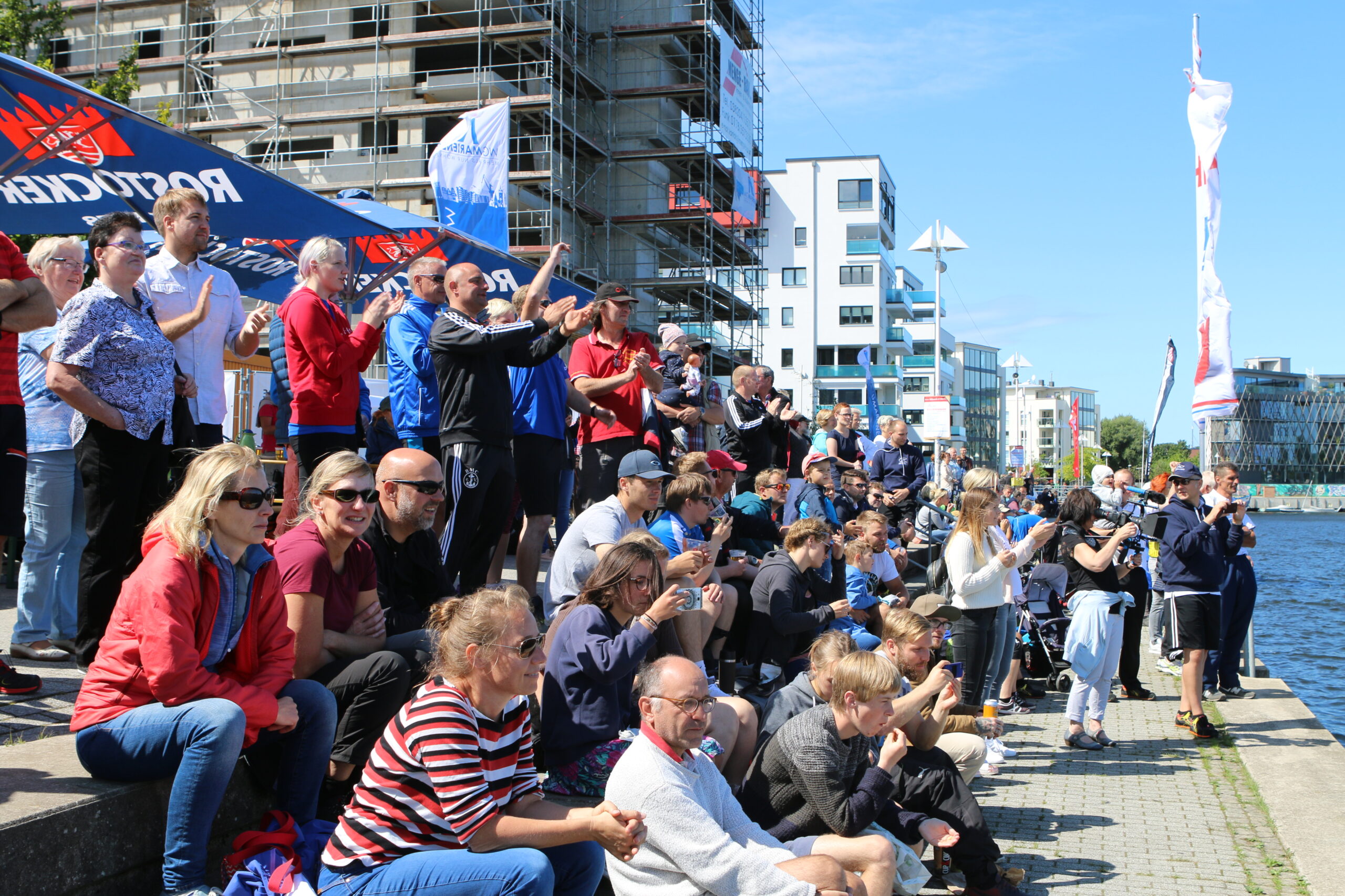 Nach schwachen Winden und Nieselregen (unter Seglern bekannt als Gratis-Peeling) am Sail-Samstag war Petrus dann doch noch gnädig und entschädigte mit ausgezeichneten Bedingungen am Sonntag alle Gäste. Nicht alle stöhnten über den leichten Wind – die SUP’ler freute das glatte Wasser bei ihrem 3. Teamsport CUP der AOK. Neun Firmenteams paddelten in spannenden Staffelrennen um die Wette und am Ende musste sich der Titelverteidiger, „Team Liebherr“, geschlagen geben. Der neue Sieger heißt nun „SUP-Teamsport“, der ebenfalls den SUP-Quidditch Cup gewann. Auch die „Waterbiker“ der Uni Rostock konnten um so einiges schneller strampeln, da die Welle niedrig blieb. In ihren eigens konstruierten Booten nahmen die Studenten gern auch den einen oder anderen Sail-Gast auf ihren Parcour mit. Zwar versank eines der Waterbikes in den Fluten, aber die Theorie aus der Uni ist ja auch nicht immer gleich funktionierende Praxis und so nehmen die Studenten sicherlich zahlreiche neue Erkenntnisse mit zurück in den Hörsaal.