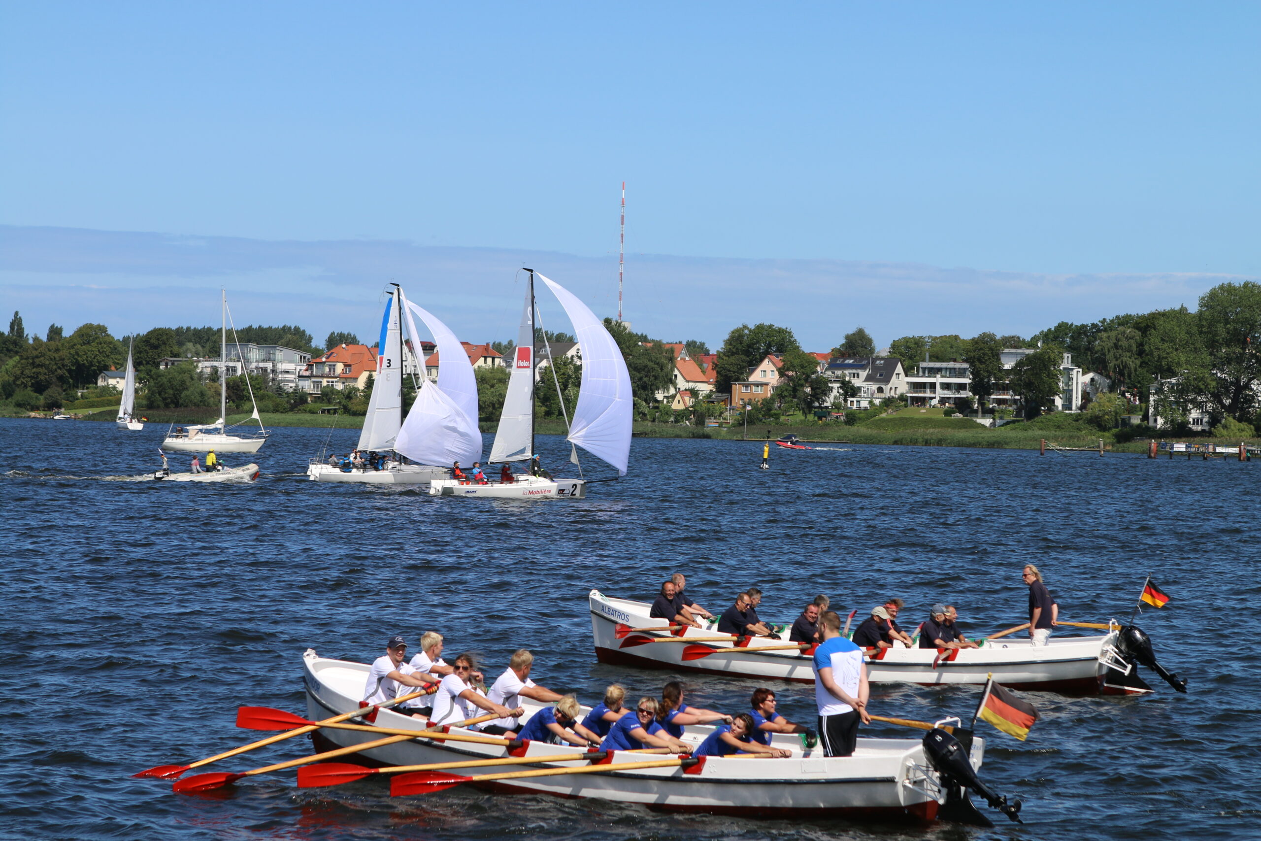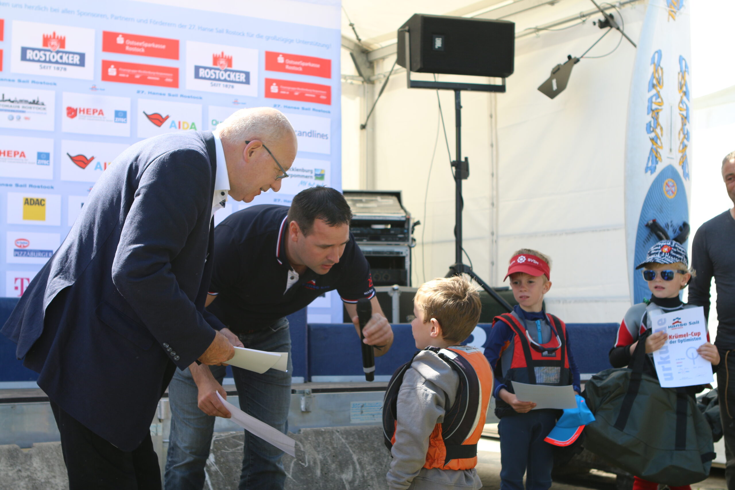 Besondere Aufmerksamkeit erhielten die kleinsten Teilnehmer im OSPA-Segelstadion – der Oberbürgermeister der Hanse- und Universitätsstadt Rostock, Roland Methling, überreichte bei der Siegerehrung des Krümelpokals, bei dem nur Kinder unter zehn Jahren teilnahmen, die Urkunden und dem Sieger, Julius Gau vom Yachtclub Warnow, den Pokal. „Die kleinen Optimisten haben tolle Bilder auf die Warnow gemalt“, freute sich das Stadtoberhaupt. Er sehe in den Kleinsten die Olympiasieger von morgen, die die Hansestadt Rostock weltweit bekannt machen und bereichern werden. Mit deutlich breiterem Kreuz als die „Krümel“ ruderten die Frauen und Männer beim Kutterpokal um die Wette. Von einer großen Fangemeinde angefeuert, gewann am Ende der Maritime Club aus Bernburg.